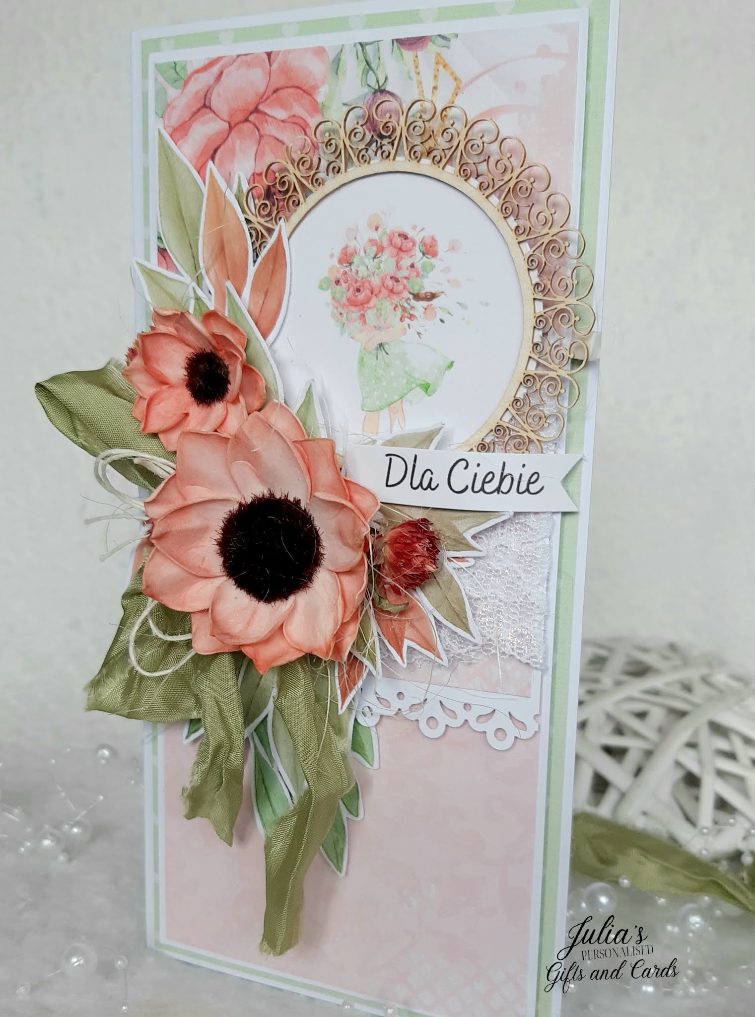 Zainspirowały mnie kolory( łososiowy i zielony),kwiaty, Wstążka oraz napis